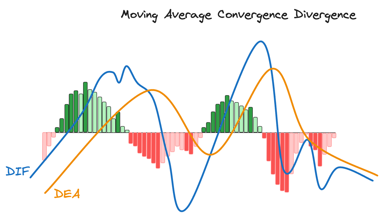 يُعد تقارب وتباعد المتوسطات المتحركة (MACD) مؤشر زخم يُولّد إشارات من خلال حساب الفرق بين متوسطين متحركين ومراقبة تقاطعاتهما. ويُستخدم لتقييم قوة اتجاه السعر واحتمالية انعكاسه. يتكون MACD من ثلاثة مكونات: الخط السريع (DIF)، والخط البطيء (DEA)، والرسم البياني (أشرطة MACD)، الذي يتذبذب فوق أو تحت خط الأساس.