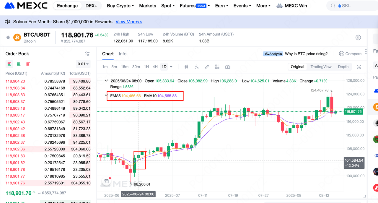 مثال: باستخدام عملة البيتكوين (BTC) على الرسم البياني اليومي كمثال، يمثل الخط الأصفر المتوسط المتحرك MA5، ويمثل الخط الأرجواني المتوسط المتحرك EMA10. غالبًا ما يستخدم المتداولون تقاطعات المتوسطات المتحركة الأسية (EMA) كإشارات شراء أو بيع محتملة. على سبيل المثال، يمكن تحديد فرصة شراء في الساعة 8:00 صباحًا يوم 24 أغسطس، عند حدوث تقاطع صعودي.