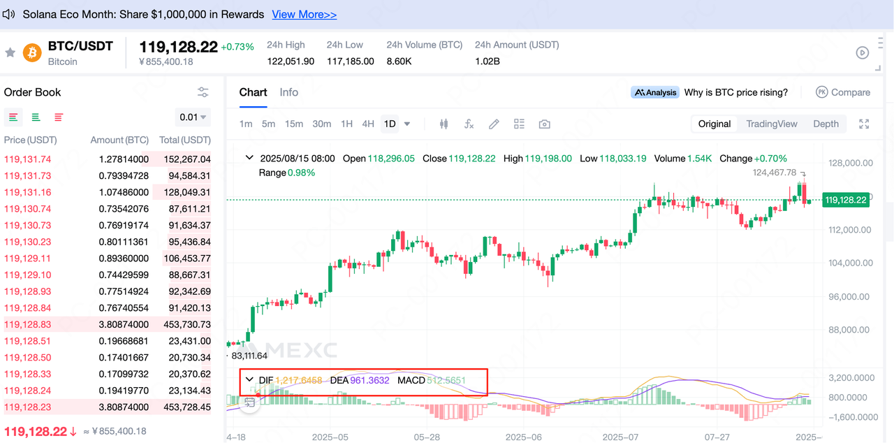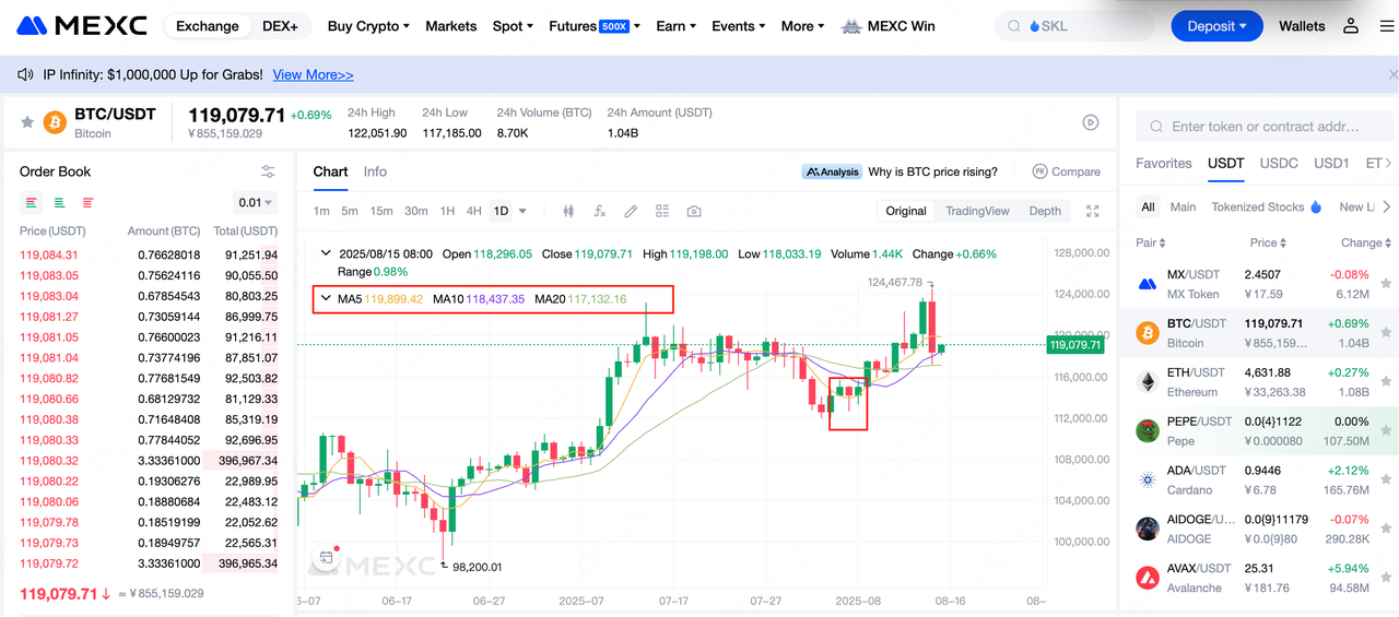 مثال: باستخدام عملة البيتكوين (BTC) على الرسم البياني اليومي كمثال، يمثل الخط الأصفر المتوسط المتحرك MA5. في 5 أغسطس، انخفض سعر البيتكوين ولامس خط MA5، وسرعان ما وجد دعمًا، ثم ارتد بشكل حاد، مما يشير إلى ارتداد قصير الأجل عن المتوسط المتحرك.