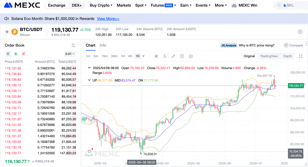 مثال: وفقًا لاستراتيجية انعكاس متوسط نطاقات بولينجر، تميل الأسعار إلى التذبذب ضمن النطاق الذي تُشكله النطاقات العلوية والسفلية. وبينما قد تخترق الأسعار هذه النطاقات مؤقتًا، فإنها عادةً ما تعود إلى نطاقها مع مرور الوقت. لذلك، يُمكن تفسير الاختراق فوق أو تحت النطاقات كإشارة تداول. على سبيل المثال، في 8 أبريل، انخفض سعر البيتكوين (BTC) إلى ما دون النطاق السفلي، مما قد يُنظر إليه كإشارة شراء محتملة.