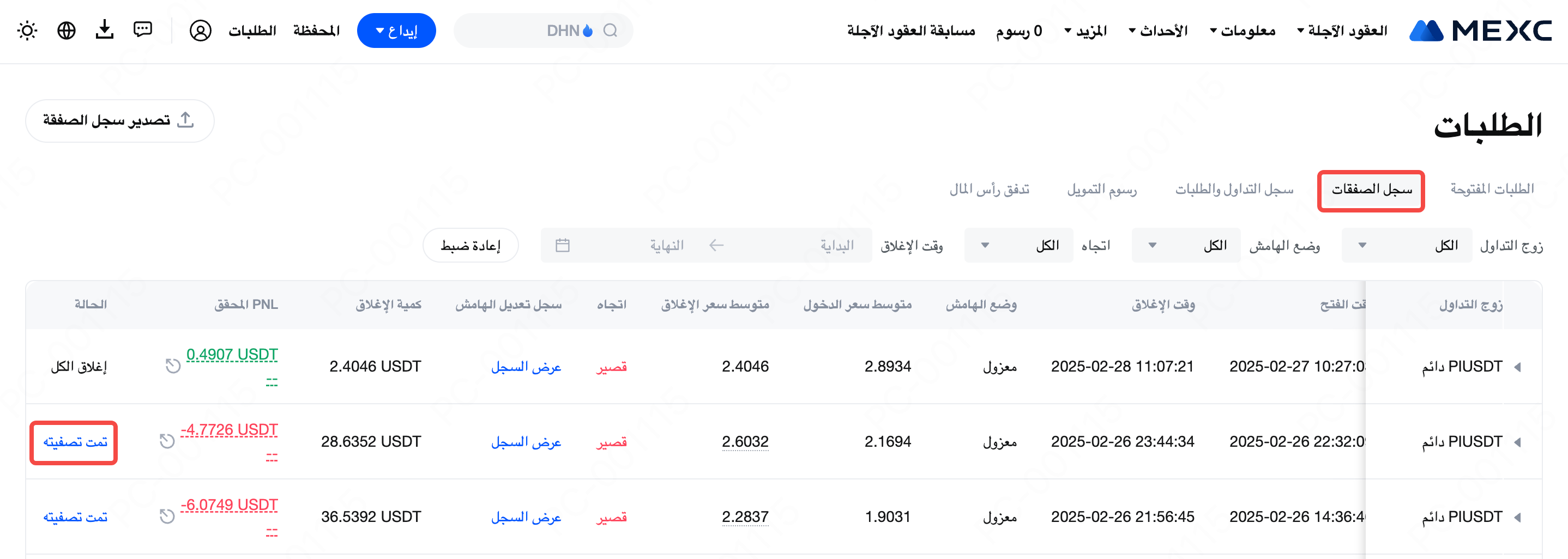 يمكنك العثور على طلبات التصفية في قسم "سجل الصفقات".