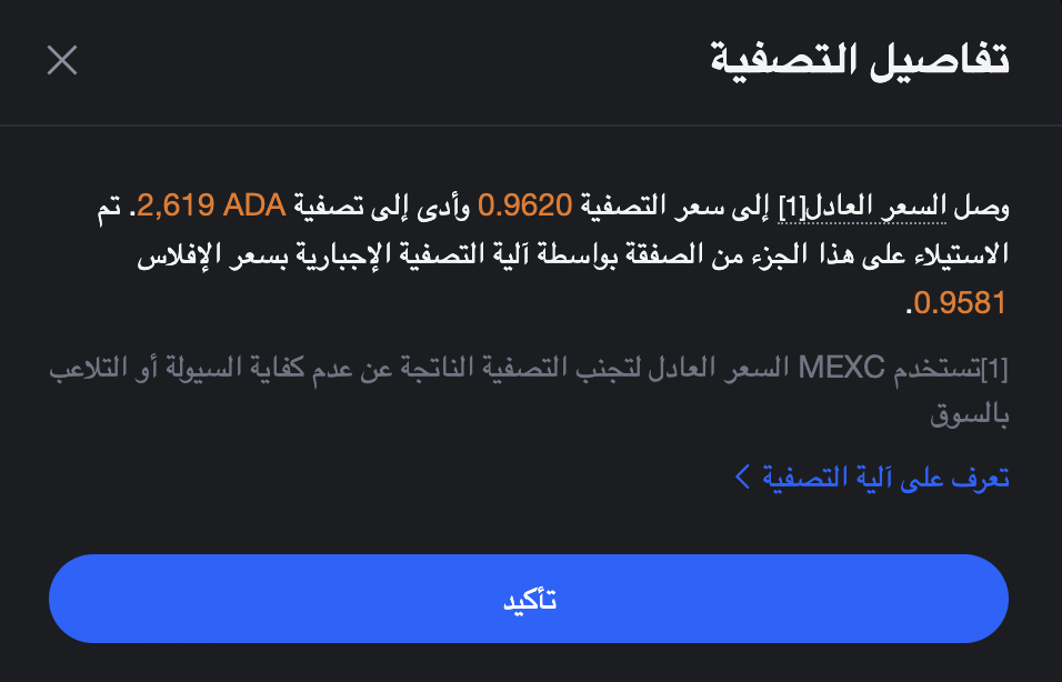 سعر التصفية ليس هو نفسه سعر الاستحواذ. سعر التصفية هو مجرد نقطة انطلاق. بمجرد حدوث التصفية، سيتولى محرك التصفية صفقة المستخدم بسعر الاستحواذ. في سجل الصفقات وصفحة "مشاركة أرباحي وخسائري"، يكون متوسط سعر الإغلاق المعروض هو سعر الاستحواذ.