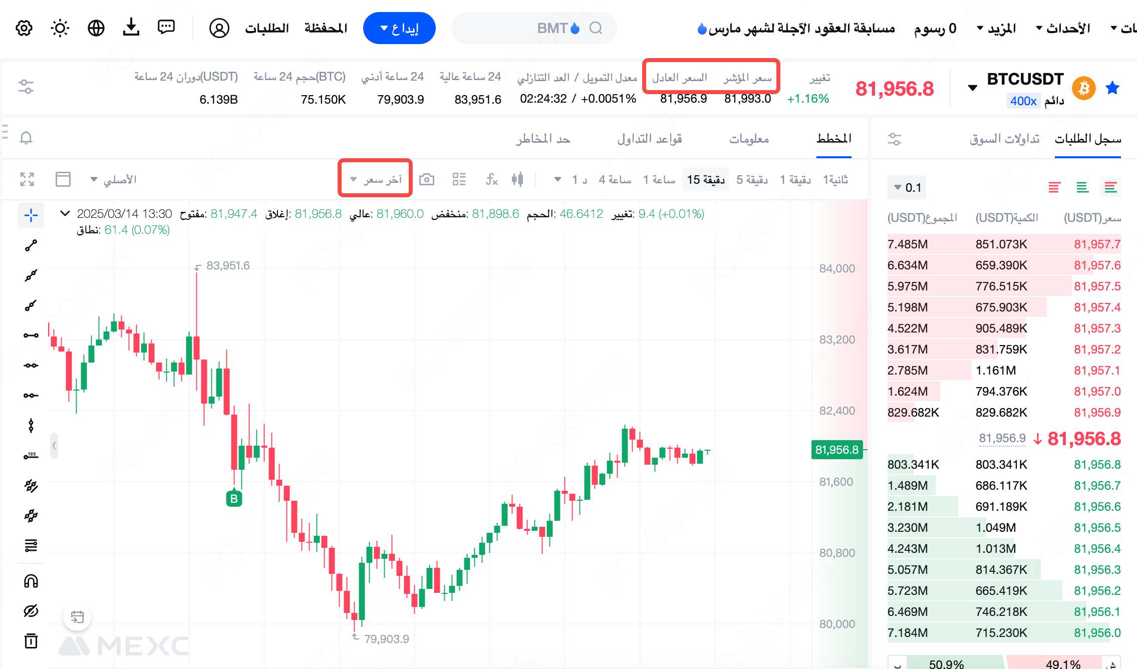 يمكن للمستخدمين الاطلاع على السعر العادل الحالي وشرحه في أعلى صفحة التداول. بالإضافة إلى ذلك، في أعلى مخطط الشموع، يُمكن للمستخدمين التبديل بين السعر العادل، والسعر الأخير، وسعر المؤشر لتتبع اتجاهات الأسعار الثلاثة بسهولة.