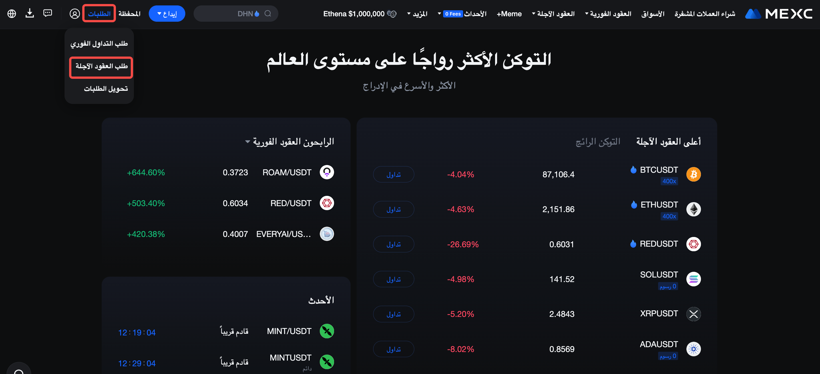 على الموقع الإلكتروني، سجّل دخولك وانقر على "طلبات العقود الآجلة" ضمن "الطلبات" في شريط التنقل أعلى اليمين.