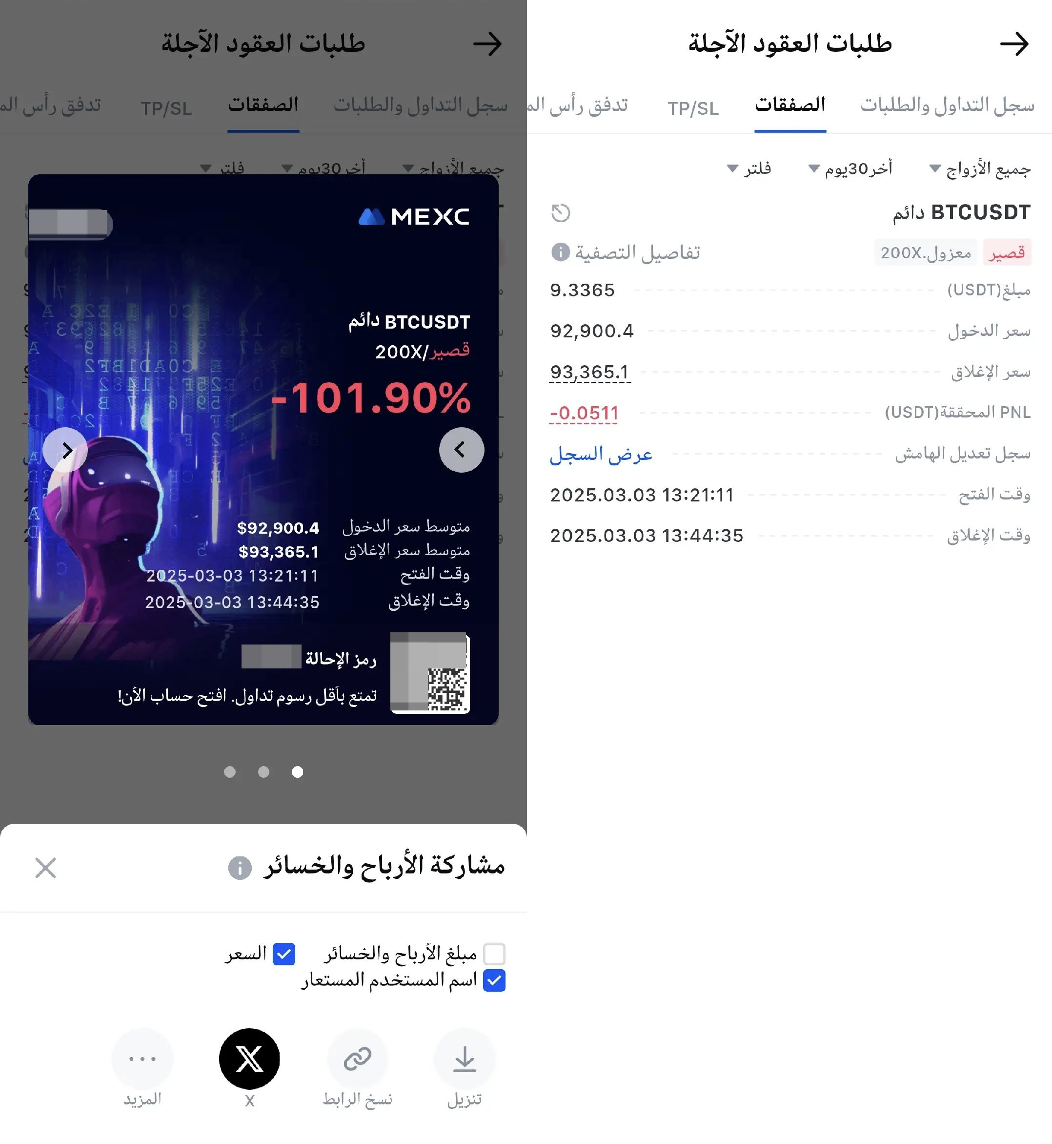 شرط التصفية: تصفى الصفقة عندما يكون هامش الصفقة + PNL غير المحقق ≤ هامش الصيانة + رسوم التصفية.