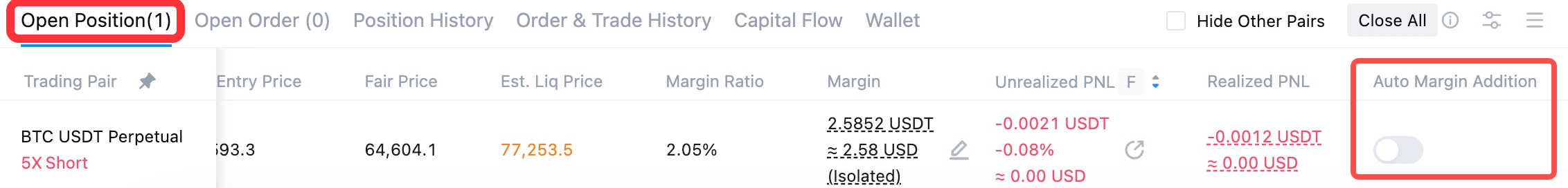 توفر MEXC ميزة إضافة الهامش تلقائيًا، والتي تُحوّل الأموال المتاحة من محفظتك إلى هامش صفقتك تلقائيًا عندما تكون صفقة معزول معرضًا لخطر التصفية.