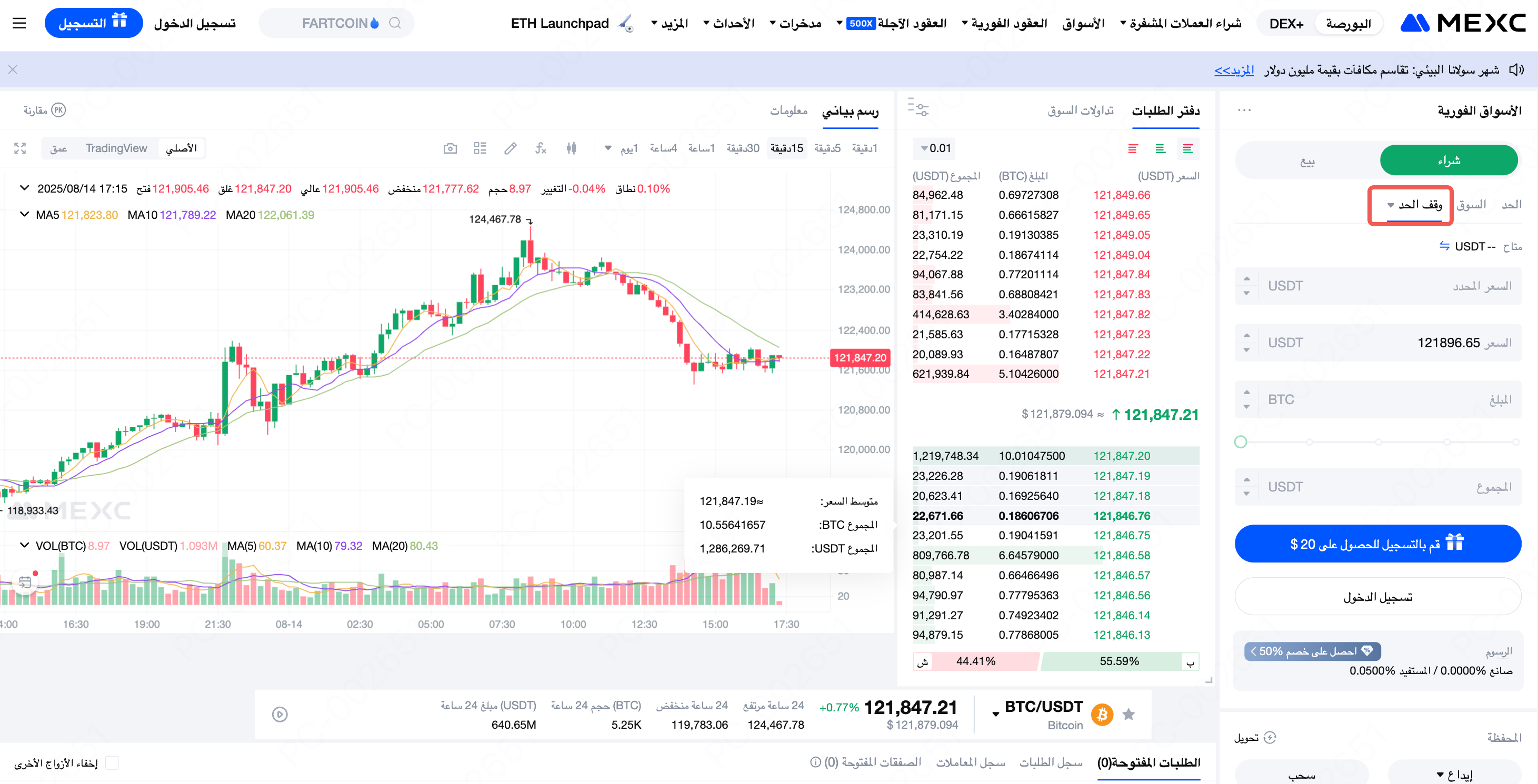 سجّل الدخول إلى حسابك على MEXC وانتقل إلى واجهة التداول. اختر وقف الحد، ثم أدخل سعر التفعيل، وسعر الشراء، والكمية. وأخيرًا، انقر على شراء BTC لتقديم الطلب.