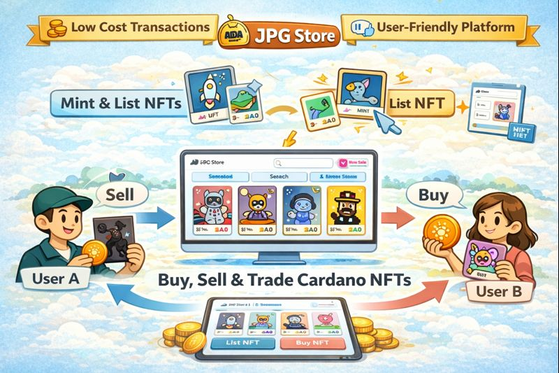 Q: What is JPG Store? A: JPG Store is the leading NFT marketplace on Cardano, where users can buy, sell, and trade Cardano-based NFTs with low transaction fees.