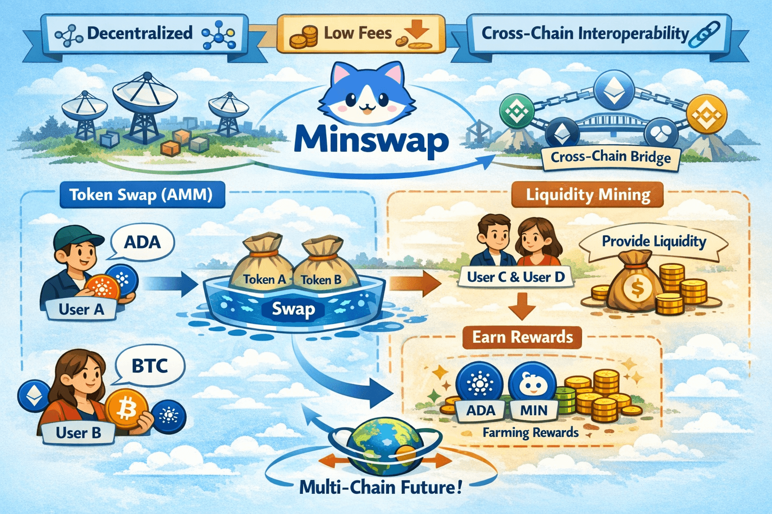 • Future Cross-Chain Support: Minswap is planning to enhance its offerings with cross-chain swaps, allowing users to trade Cardano-native tokens with tokens from other blockchain networks, further increasing its interoperability and liquidity.