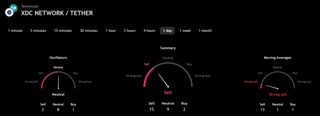 The technical analysis indicators such as Relative Volume (RVOL), Moving Average (MA), and Relative Strength Index (RSI) of XDC Network (XDC) are shown in the chart below.
