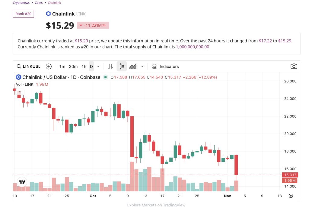 Chainlink’s native token, LINK, fell sharply over the past 24 hours, sliding 11.22% to $15.29 at the time of writing, according to data from CryptoNews.