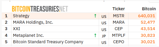 PANews reported on October 1 that according to data from Bitcoin Treasuries, after announcing an increase of 5,268 bitcoins, the total bitcoin holdings of Japan's listed bitcoin treasury company Metaplanet have surpassed the Bitcoin Standard Treasury Company. With 30,823 bitcoins, it has become the world's fourth largest listed bitcoin treasury company, second only to Strategy, MARA and XXI.