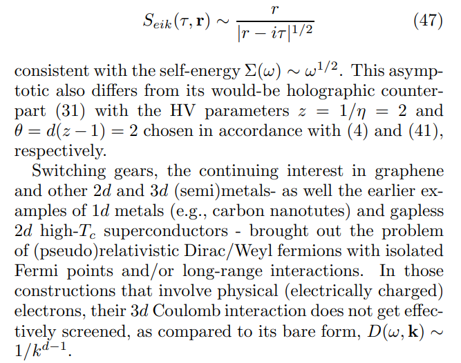 \ Interestingly, if the interaction function D(ω, k) were to be molded into (1) by choosing ρ = 2 and ξ → −∞ the HV exponents would be taking values z = 1, θ = 0, thus satisfying (41) but not (40). On the other hand, matching the holographic asymptotics (31) would only be possible for θ = 2 which doesn’t satisfy (40) either.