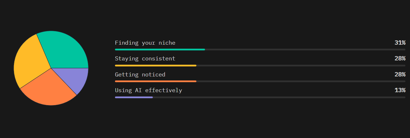 \ With 31% of respondents choosing “Finding your niche,” it is clear that even with an increasingly saturated online space, personality still trumps volume. Writers constantly yearn for a unique voice - a meaningful topic that resonates and makes a personal impact in a noisy, algorithm-fed landscape.
