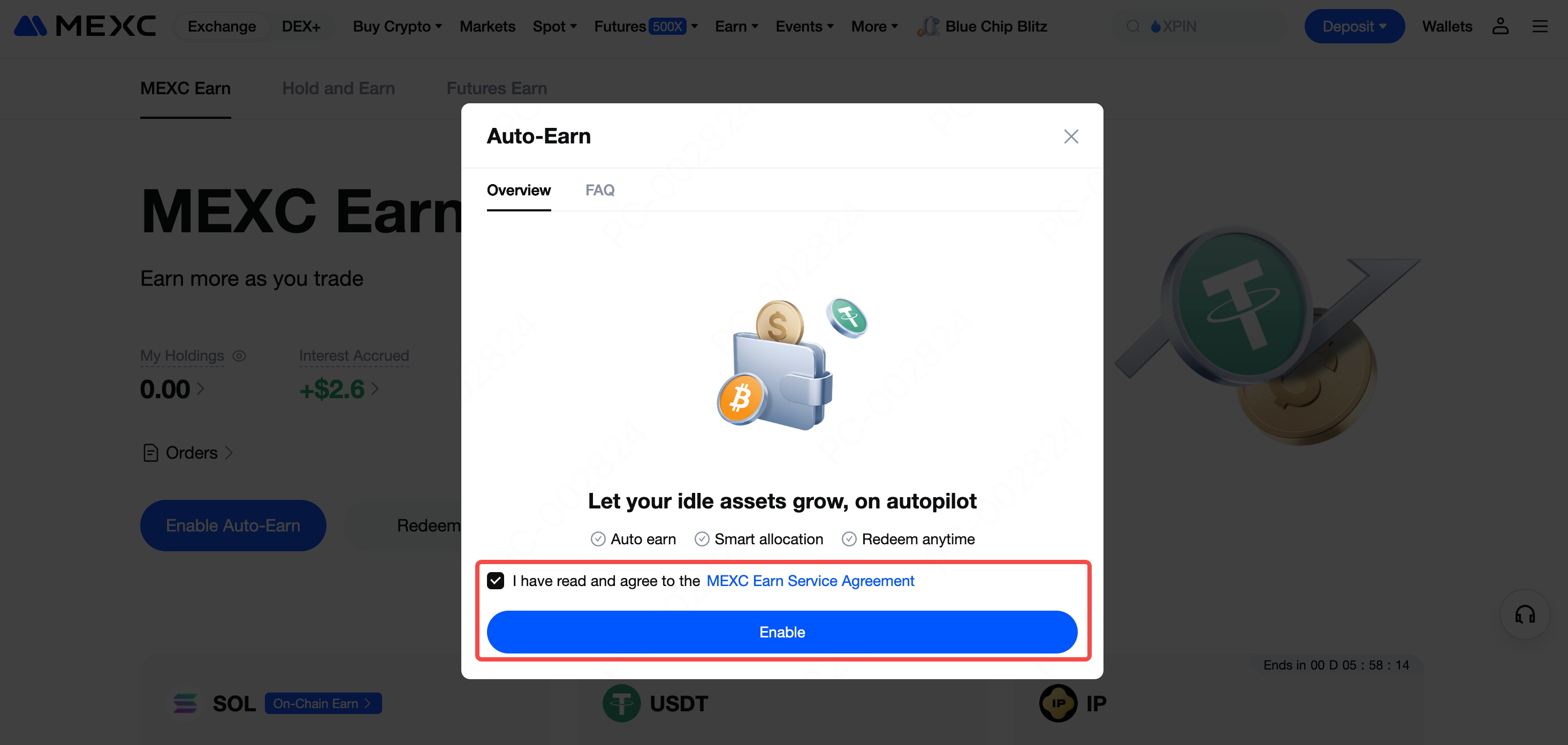 На странице MEXC Заработок нажмите «Включить Автозаработок».