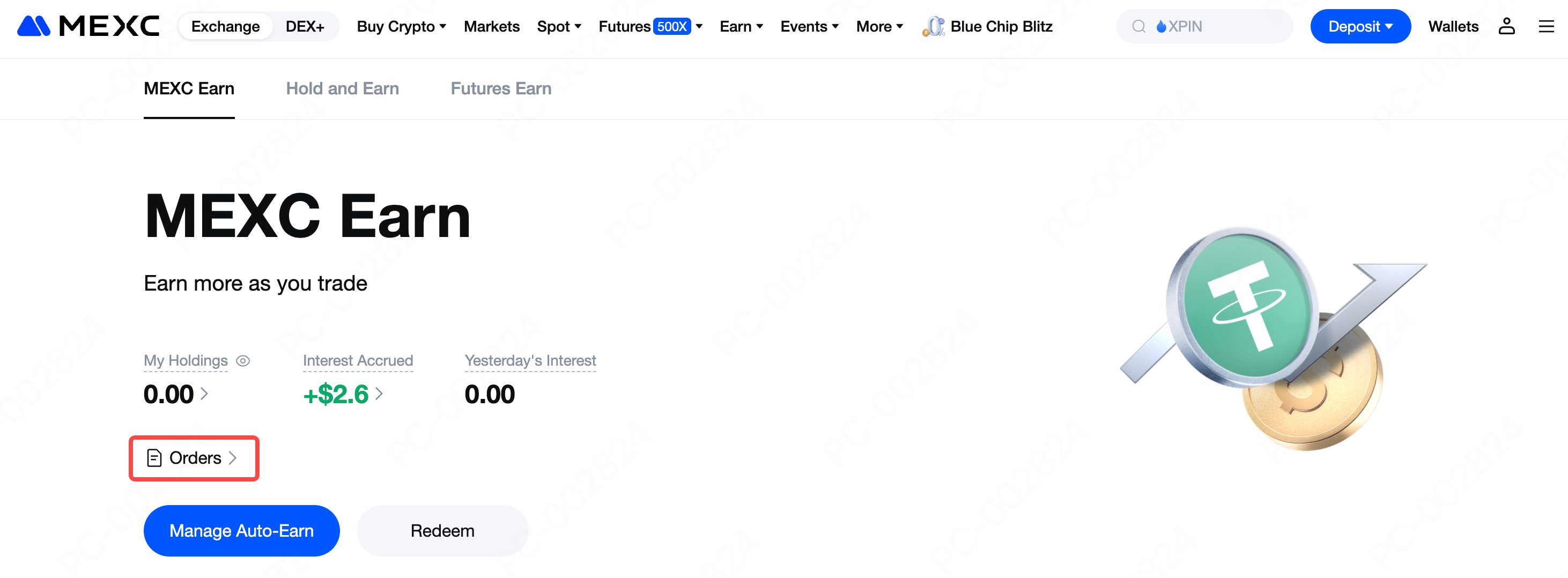 На странице MEXC Заработок нажмите «Мои ордера», затем нажмите «Погасить» на продукте, который хотите вывести.
