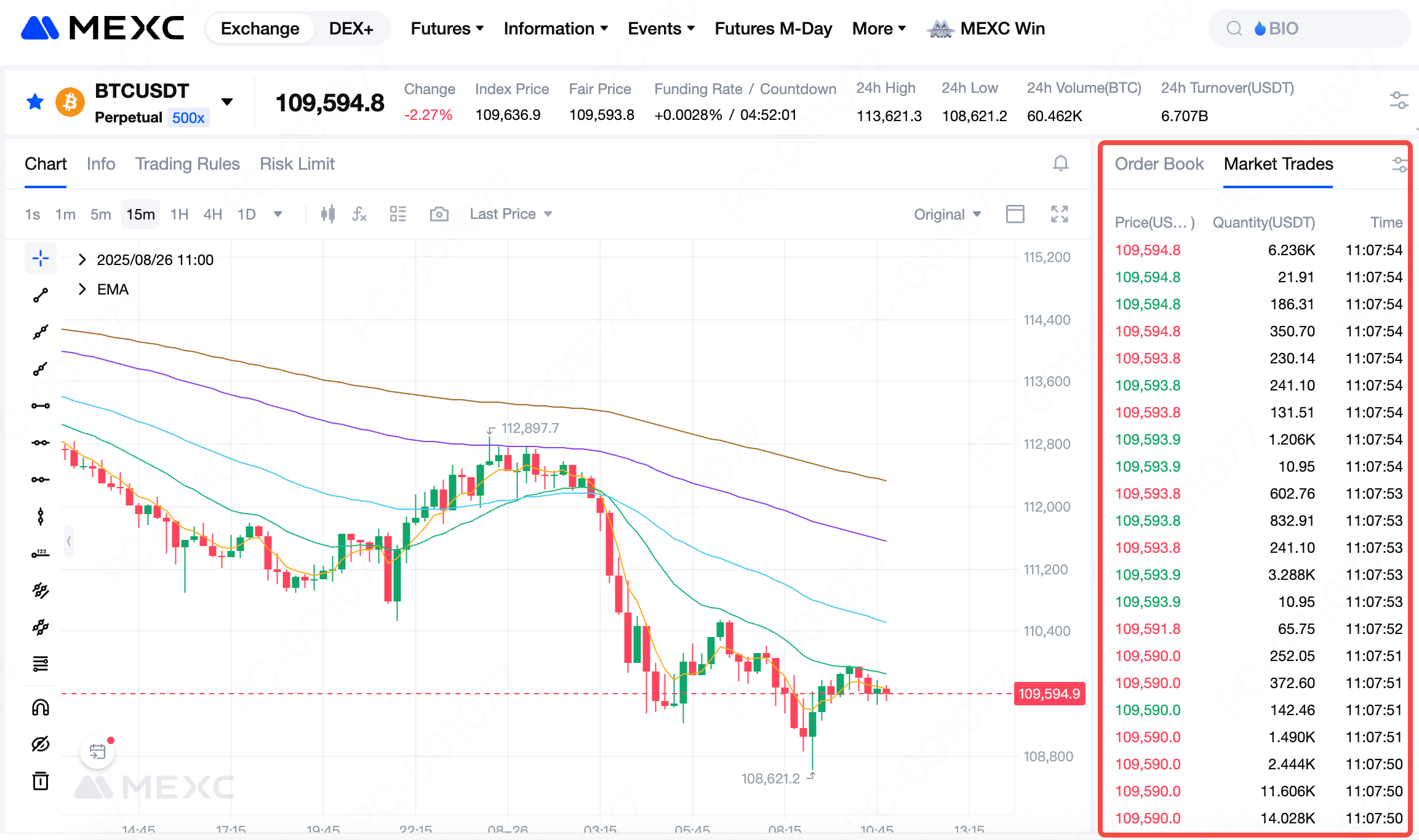You can view this price by clicking on the Market Trades tab in the order book area on the MEXC Futures trading page.