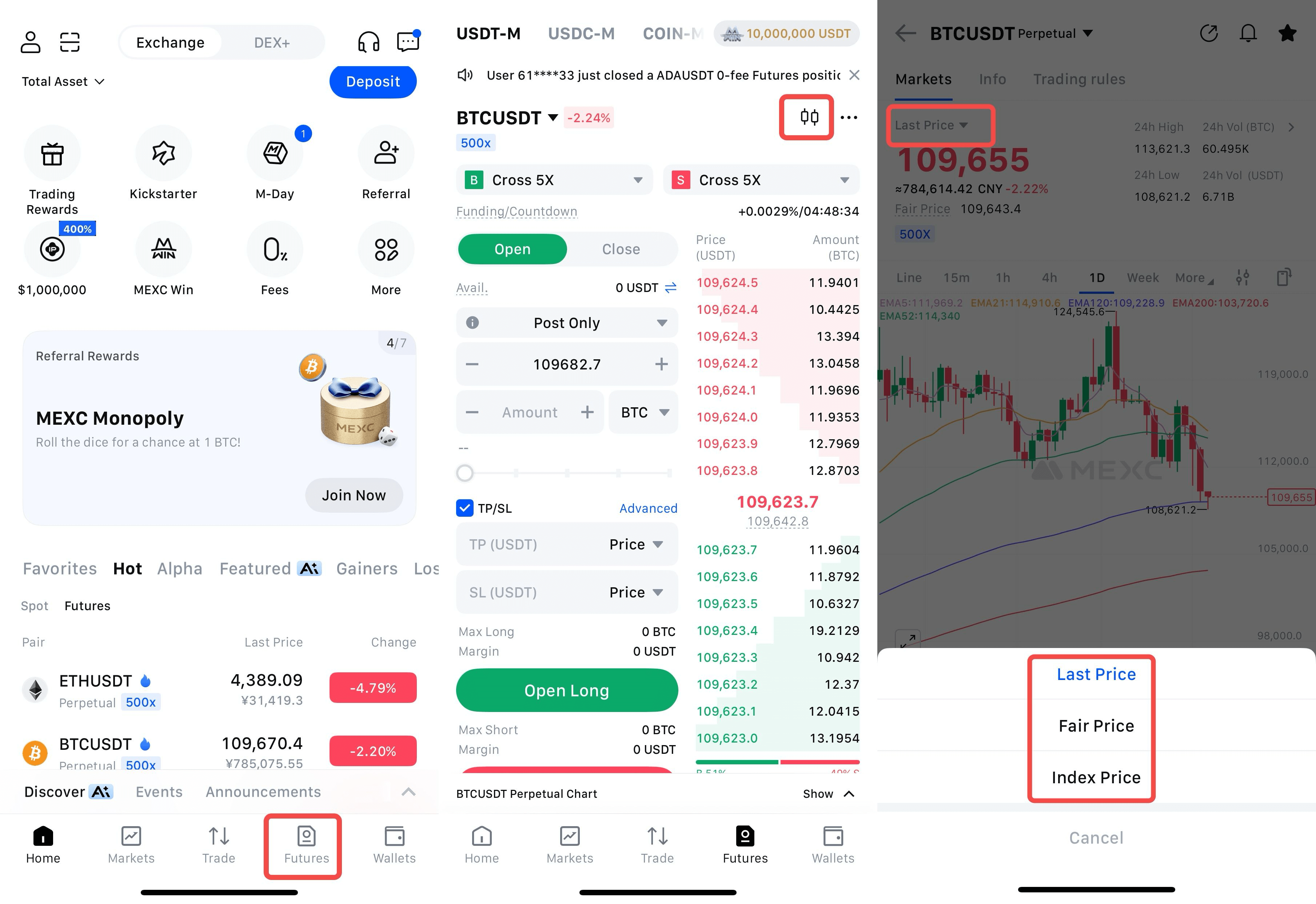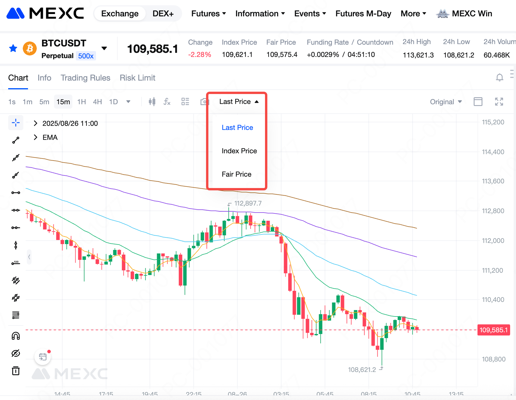 Open the Futurestrading page on MEXC. Hover your mouse over Last Price ▼, Index Price ▼, or Fair Price ▼ above the candlestick chart, and a dropdown menu with three price options will appear. Click to select the price you want to use to switch between them.