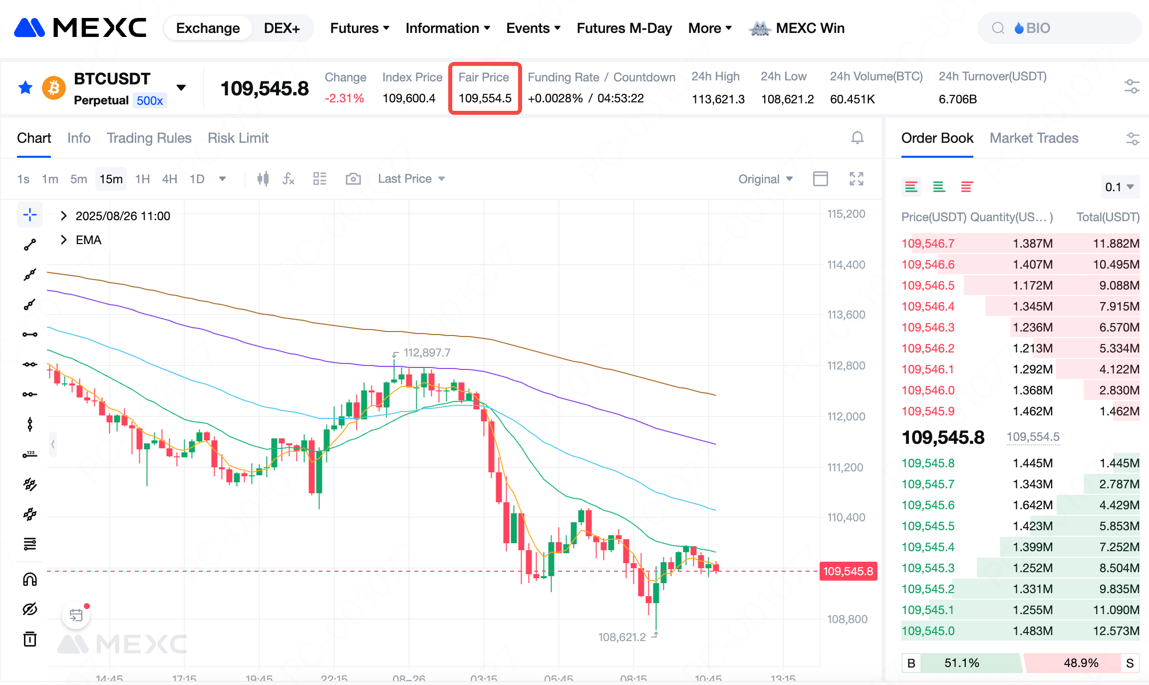 To improve market stability and reduce liquidation risk during abnormal market fluctuations, MEXC Perpetual Futures uses a specially designed fair price marking system. Instead of using the last price, the system sets the mark price to the fair price. This helps prevent unnecessary deviations between the market price and the price index caused by market manipulation or lack of liquidity, thereby avoiding unnecessary liquidation.