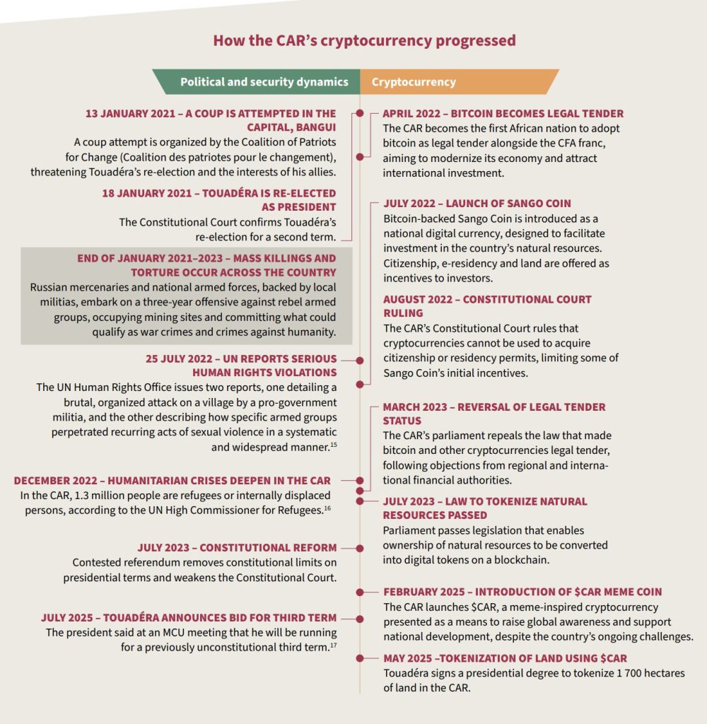 The report, titled “Behind the blockchain: Cryptocurrency and criminal capture in the Central African Republic,” paints a stark picture of how the country’s crypto ventures, from adopting Bitcoin to launching Sango Coin and the CAR meme token, have unfolded in a fragile state marked by limited electricity, low internet penetration, and weak regulatory oversight.