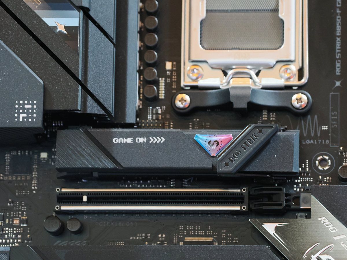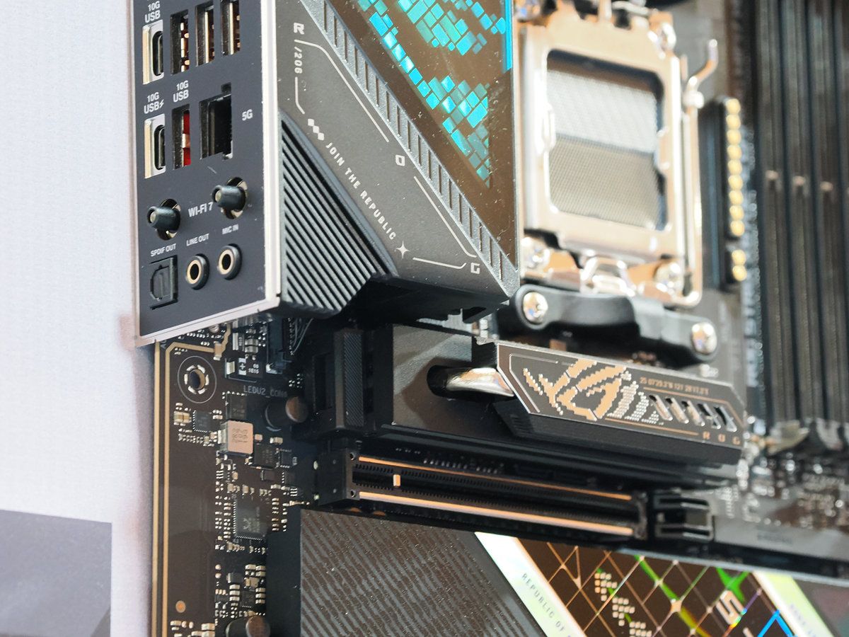 另外筆者也與華碩負責主機板的工作人員聊到一些設計的趨勢,華碩工作人員提到由於此次AM5新款主機板皆增強供電設計,旗艦產品的相數進一步提高、TUF等級亦提升至前一代ROG Strix的供電設計,對於頂級主機板不得不將第一條PCIe插槽向下挪,部分款式已經把PCIex16挪到機殼的第三條,也增添在主機板配置PCIe Gen 5的難度,不過團隊仍盡可能將通道有效用於M.2 SSD。