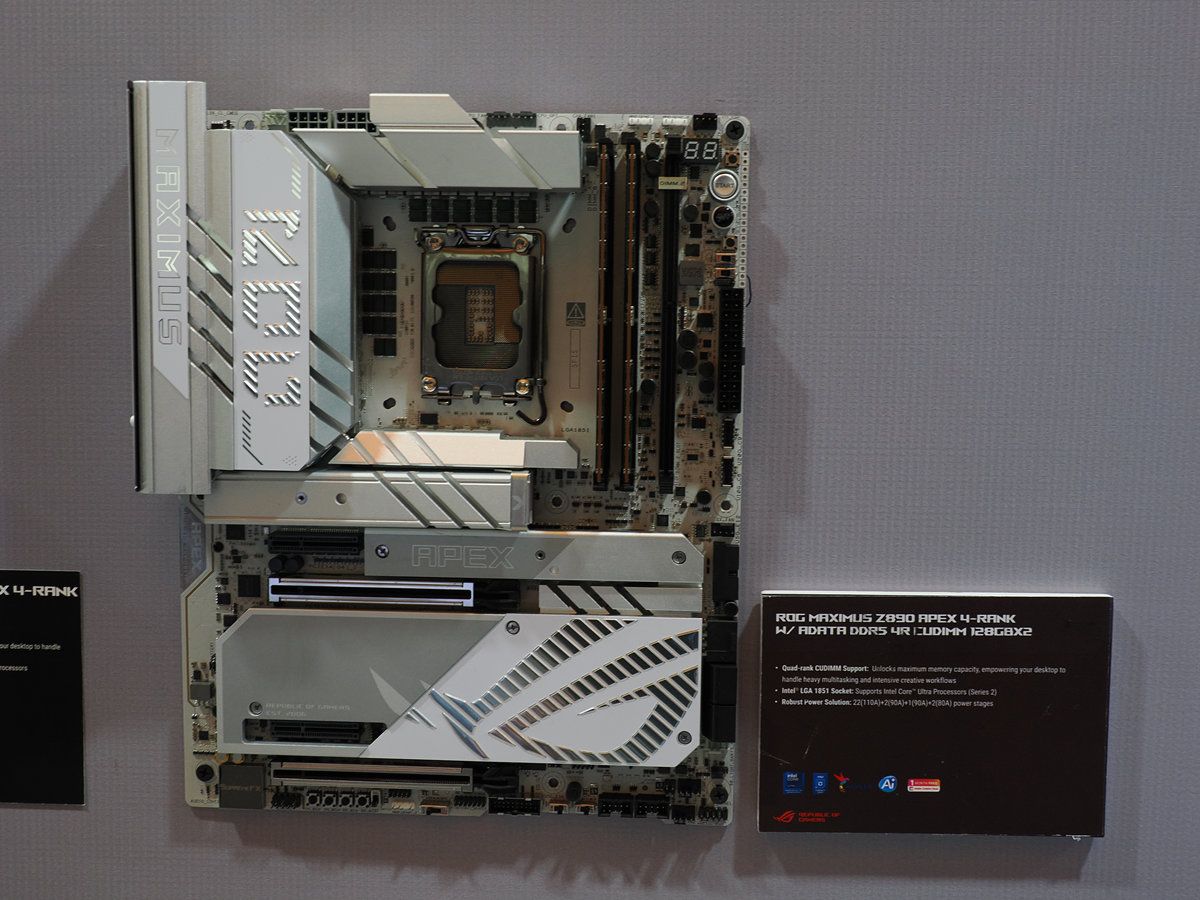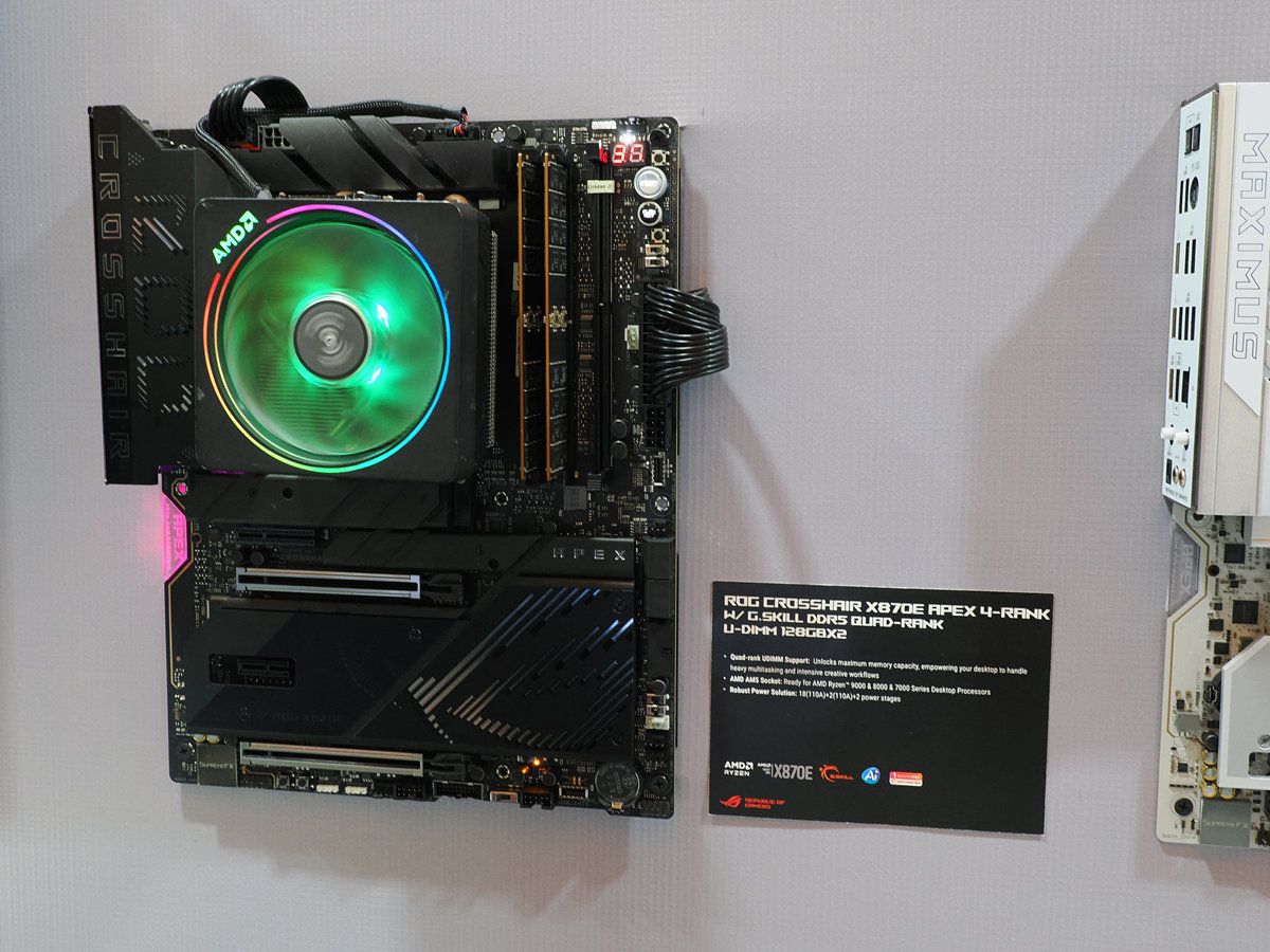 不同於另外兩家展示CQDIMM的友商皆採用Intel Z890平台,華碩則大膽地透過CROSSHIRE X870E APEG 4-Rank主機板展示AMD平台與4-RANK CQUDIMM的組合,主要是由於現階段AMD仍未正式支援具有獨立同步功能的CUDIMM,故華碩的CROSSHIRE X870E APEG 4-Rank等於是作為前瞻AMD平台與CUDIMM以及更大容量的CQDIMM的可能性,與華碩合作展示CQDIMM模組的則是G.Skill芝奇。另外還有一張Intel平台的MAXIMUS Z890 APEX 4-RANK也同樣採用雙記憶體插槽與支援CQDIMM。