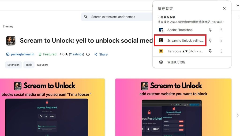 ▲Chrome擴充工具「Scream to Unlock」用意在協助用戶專注,將鎖住社群平台直到用戶崩潰大喊「I'm a loser」為止。▲下載後點選擴充工具就能夠開啟。▲用戶可以設定想要鎖住的網頁,「Scream to Unlock」會預設鎖住Facebook、X等社群平台,選擇「Remove」就能夠移除。如果有其他想要封鎖的網頁,也能填入下方欄位。▲在設定好後,進入封鎖的網頁,就會看到「I'm a loser」頁面並開啟麥克風。▲將根據音量大小決定網頁解鎖時間,喊得越大聲、網頁解鎖越久。▲系統也會要求你乖乖把「I'm a loser」幾個字唸出來,可不能敷衍了事。