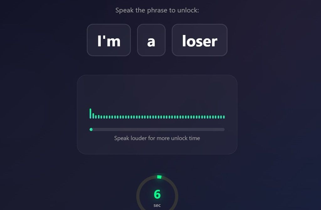 等等,如果你不是崩潰到尖叫,而是想要偷偷出賣自尊心換一點自由時間,那可別以為小聲唸完「I'm a loser」就沒事了。這個工具設計精妙在於,將根據用戶的音量大小決定解鎖時間長短,沒錯,即使你承認了自己是個失敗者,也只能獲得短暫的自由,如果你想要有更長的自由時間,那麼你必須要大聲、更大聲,向麥克風展現你成為loser的決心。