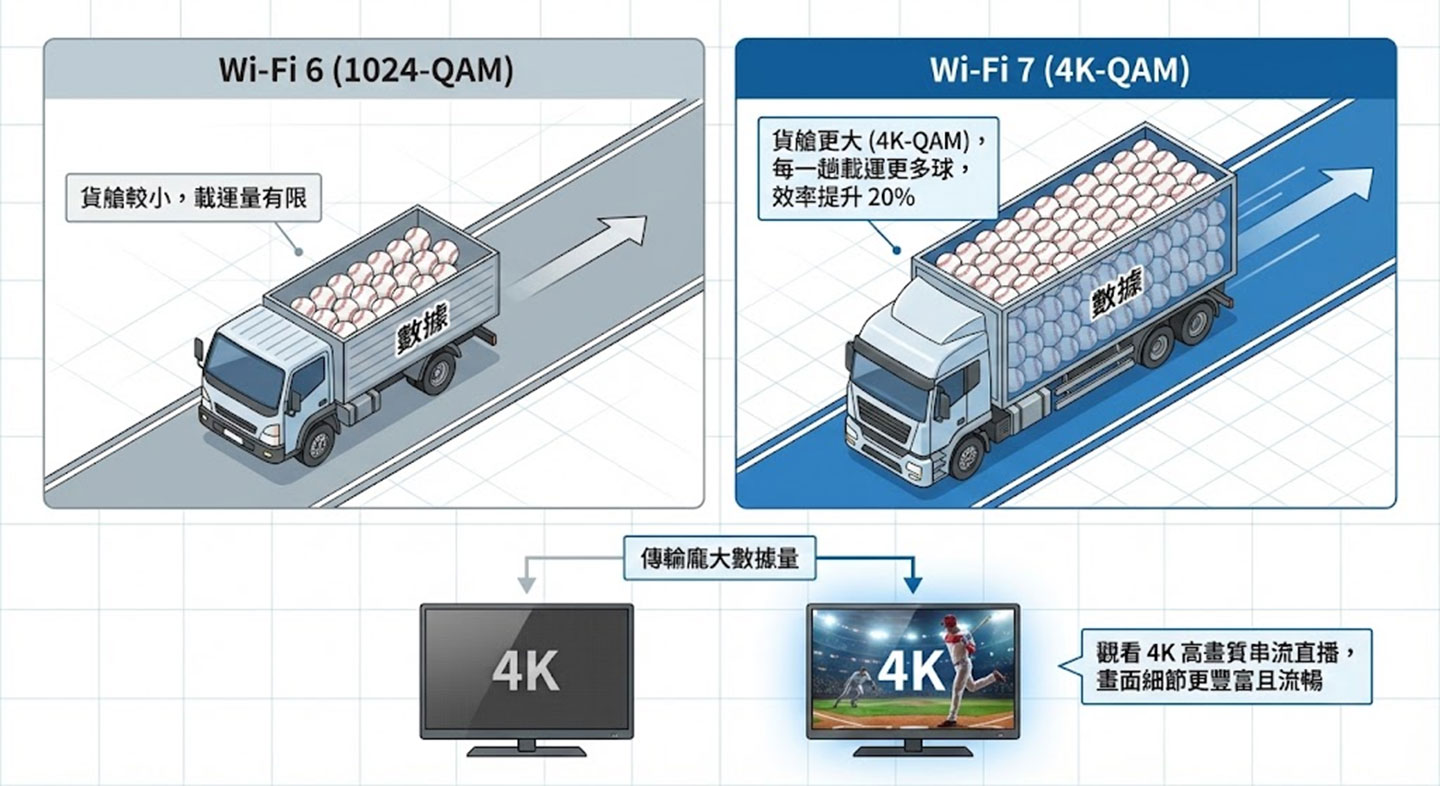 Wi-Fi 7 的另一個關鍵技升級就是與傳輸效能息息想關的 4K-QAM 技術,透過優化可大幅提升傳輸效率達 20%,以載運棒球的卡車作比喻,4K-QAM 就像是換了貨艙更大的車型,每一趟能載送更多的球,同時間內能傳輸更龐大的數據量,這對於觀看 4K 高畫質串流直播來說,畫面細節會更加豐富且流暢。
