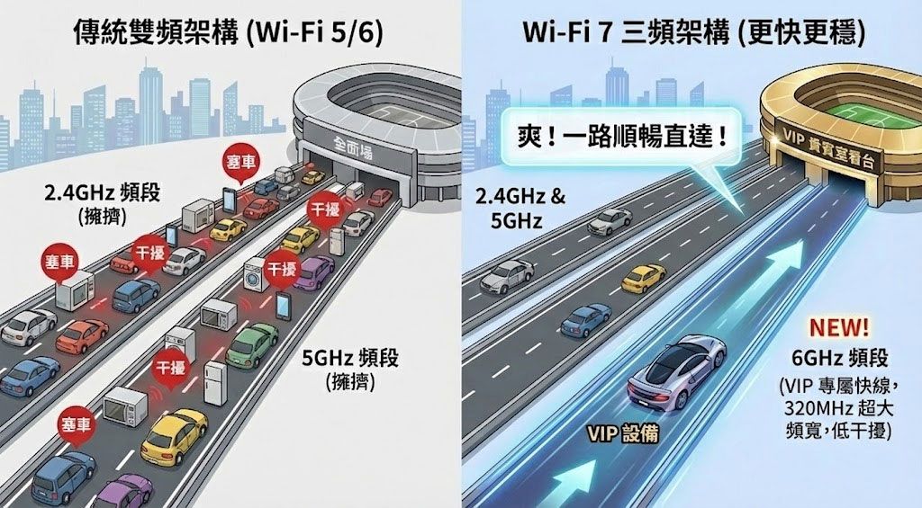 ▲Wi-Fi 7 新加入的 6GHz 頻段不只擁有超大的 320MHz 頻寬,更能避免老舊設備的連線干擾,就像是專屬通道,直達 VIP 貴賓室看台!